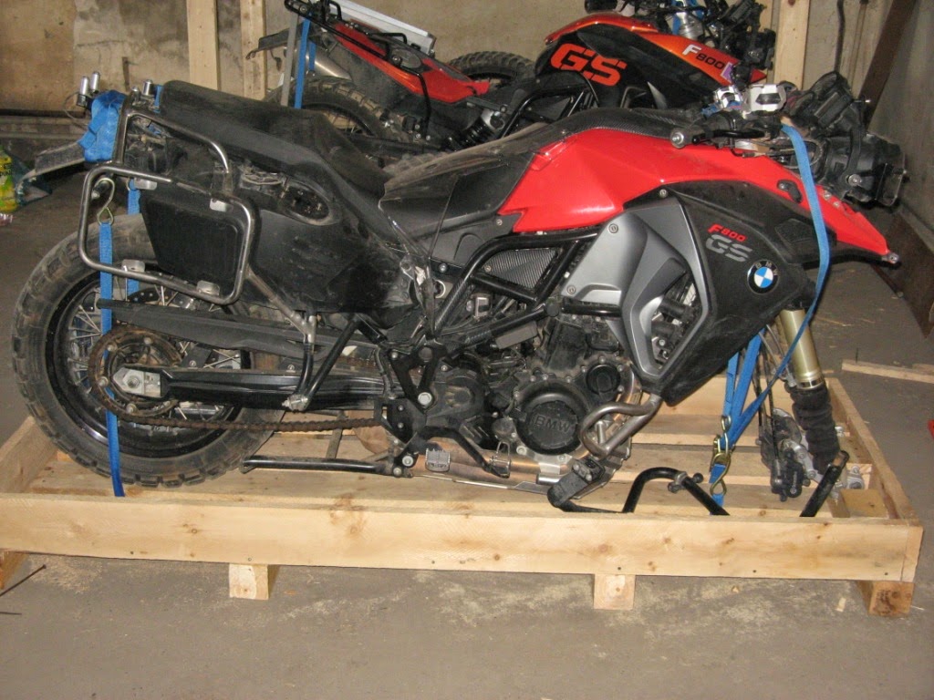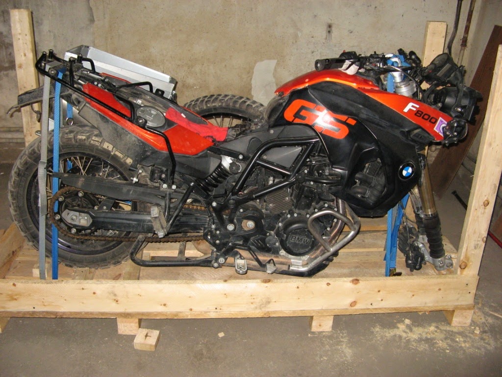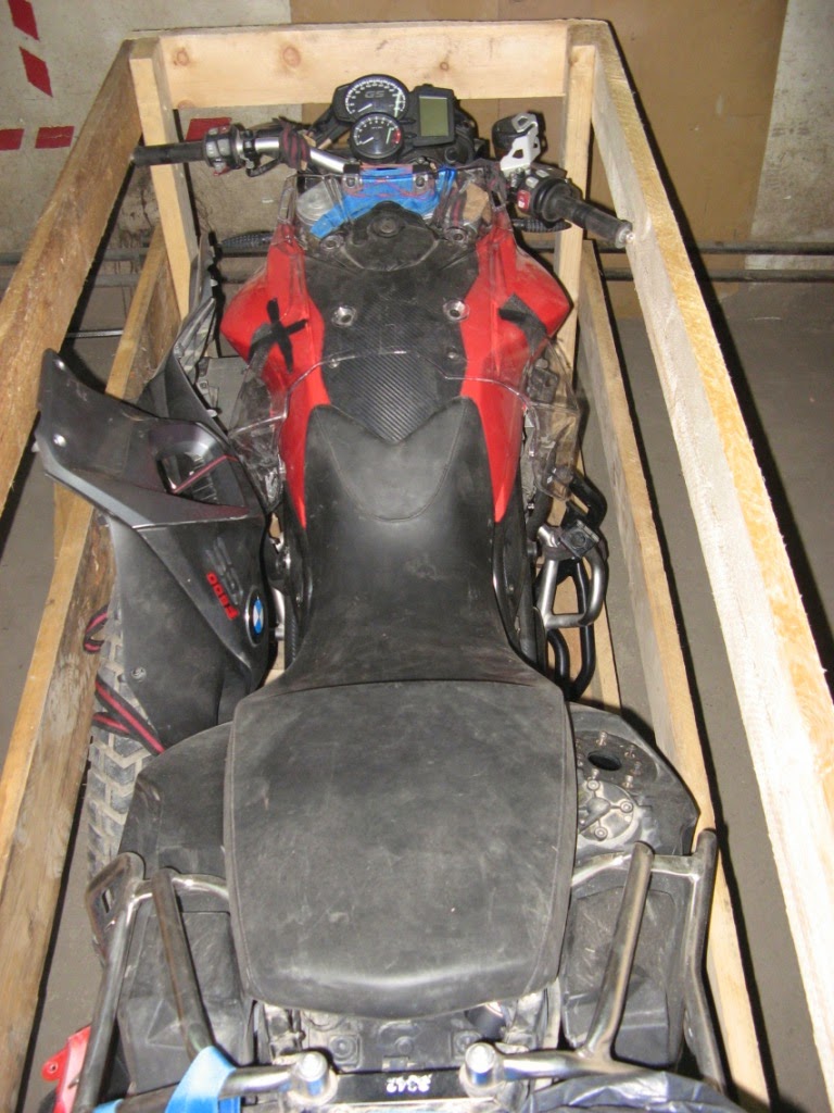 Dann ging es Zug um Zug. Motorrad auf die Bodenplatte der Kiste, Vorderrad raus, Federbein und Gabel auf Block ziehen, noch Seitenteile, Lenker abbauen, Batterie abklemmen und Tank leer machen. Dann alle abgeschraubten Motorradteile und Alu-Koffer in die Freiräume der Kiste verstauen.
