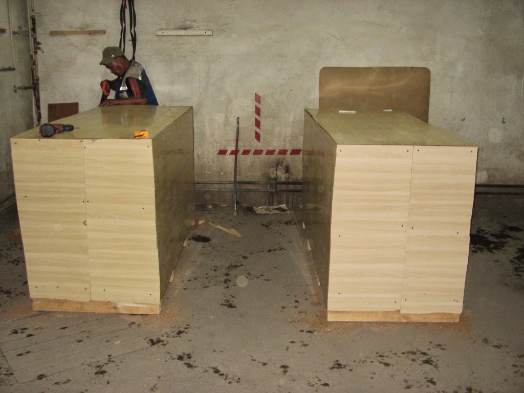 Um 10 Uhr war zwei Kilometer entfernt vom Hotel der Treffpunkt mit dem Kistenbauer für unsere Motorräder. Als wir dort komplett bepackt mit unserm gesamten Reisegepäck ankamen, lagen bereits ein paar Bretter und Papp-Funier (Schrankrückwände) am Boden in einer Hofeinfahrt. Nach kurzer Diskussion durften wir dann in die dortige Tiefgarage fahren.